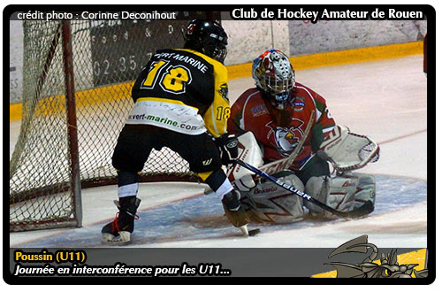 De rencontre pour Rouen 1 en Poule A, il n'y aura finalement pas. Voyant son match reporté, c'est en spectateur de cette journée d'interconférence que les Poussins de Rouen 1 garderont un œil vigilant sur les deux autres confrontations de leur poule. Ainsi, dans le duel des franciliens, les Jets de Viry 1 tirent leur épingle du jeu face aux Comètes de Meudon avec une victoire 6-2 qui leur permet de se hisser à la première place du classement de la Poule A. Derrière, les joueurs de l'Essonne, on aurait pu s'attendre à voir pointer le bout de la crosse picarde d'Amiens 1 mais il n'en sera finalement rien. Sur sa glace, les Gothiques d'Amiens 1 se feront surprendre par les Bisons de Neuilly-sur-Marne, les nocéens vainqueurs 5-3 au Coliséum en profitent pour truster la deuxième place du classement avant de recevoir lors de la prochaine journée les Dragons de Rouen 1.