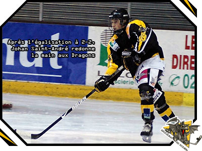 Dans ce derby de l'excellence, la décision sera prise durant un dernier vingt minutes prolifique en buts. Jusqu'alors peu propice aux buteurs, la rencontre s'emballait à l'image de Johan Saint-André qui appuyait sur la pédale d'accélérateur dès les premières montées du troisième tiers. Sous l'impulsion du lutin orléanais, les Dragons prenaient à nouveau la main (43'03) avant qu'Alexandre Chergui dans la foulée (46'26) n'instaure une distance de sécurité plus intéressante (46'26) Menant 4 buts à 2 désormais, les rouennais pouvaient désormais envisager d'arriver à bon port. Même si Joel Dosreis réduisait la marque (4-3 à 47'23), Alexandre Chergui continuait de faire se trémousser le palet au fond des filets picards pour son triplé personnel (49'49)