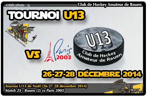 Encore quelques minutes à jouer dans cette rencontre et les rouennais semblaient accuser la fatigue de la journée. Des agglos dans les patins, Rouen (2) ne pouvaient plus accélérer et les minutes seront longues jusqu'à la sirène finale alors que Jonah Marette (23'47) ajoutait un troisième but dans le camp des parisiens. Fin du match 3-0 et fin de cette deuxième journée du tournoi U13. Dernière journée demain avec la suite des matchs de classement et en ouverture le match pour les places 5 à 8 la confrontation entre les jokers de Cergy et les coqs de Courbevoie à 8h30.