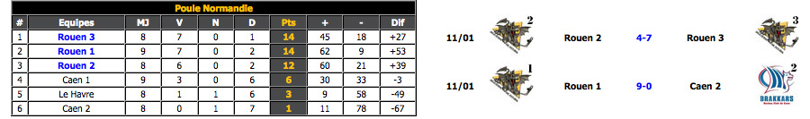 En effet, si Rouen (1), après son large succès la semaine dernière acquis au Havre (12-0), aura récidivé son larcin cette fois à « la maison » face à Caen (2) 9-0, c'est à la deuxième place du classement qu'ils termineront le week-end en dépit de leur victoire. La faute à une défaite subie à la fin du mois de novembre face à Rouen (3) 2 buts à 1. Quoiqu'il en soit alors qu'il ne reste que deux matchs à jouer pour Rouen (3) et Rouen (2) et un seul pour Rouen (1), l'ordre du classement de cette poule Normandie ne devrait être connu qu'à l'issue du dernier week-end, celui du 14 et 15 février avec la confrontation entre Rouen (1) et Rouen (3), Rouen (2) recevant sur l'Ile Lacroix les Dock's du Havre.
