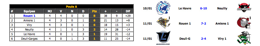 C'est donc dans un contexte de solidarité que les « Charlie » des deux équipes se disputeront le morceau de caoutchouc sur l'Ile Lacroix dans le cadre de l'interconférence. Le sport reprenant ses droits, Rouen (1) en décrochant un précieux succès face aux picards (7-2) aura réalisé la très belle opération du week-end au classement de la Poule A. Dans une poule contrôlée par le triumvirat Rouen, Amiens, Viry, tous trois titulaires avant la rencontre de six points, les Dragons, au bénéfice, de leur victoire face à Amiens, prennent seuls la première place de la Poule.