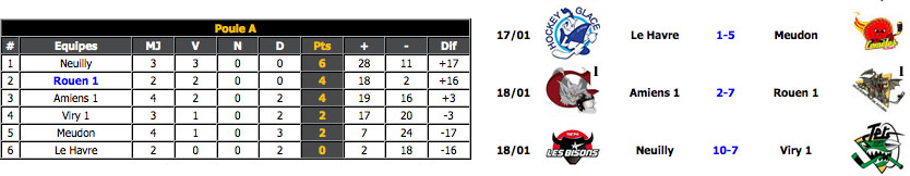 Après un première succès paisible face aux Comètes de Meudon (11-0), c'est face à Amiens (1) que les rouennais devaient s'atteler pour négocier leur deuxième sortie en interconférence. Sur la deuxième marche du podium avec un bilan de deux victoires (8-4 face à Viry et 6-0 contre Meudon) pour une défaite à domicile face à Neuilly-sur-Marne (3-5), les Gothiques d'Amiens avaient, comme il est souvent coutume en Picardie, tous les atouts nécessaires pour contrarier les rouennais. Pourtant, c'est un deuxième succès qui attendra les protégés de Christophe Renard avec une solide victoire 7 buts à 2 qui leur permet de chaparder à la deuxième place du classement à la formation picarde à deux points derrière les Bisons nocéens.