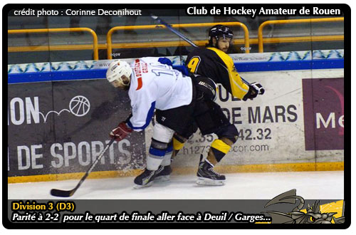 Quoiqu'il en soit, après une première période au cours de laquelle ni les uns ni les autres ne parvenaient à trouver l'ouverture, les deux portiers respectifs, l'espoir rouennais Tom Aubrun et le hongrois Tamas Kiss, rivalisant d'adresse pour conserver leur cage inviolée, à la mi-match, sur une séquence en avantage numérique, l'association parisienne trouvait l'ouverture du score par l'intermédiaire de Nicolas Cousin (0-1 à 29'56) Une bien mauvaise opération pour les Dragons qui ne les empêchera pas de réagir sitôt la troisième période lancée. Reprenant le fil de la conversation par l'intermédiaire de Maxime Dordet à la réception d'une passe de Valentin Jacques pour l'égalisation (1-1 à 43'26), les rouennais retrouvaient de la couleur et s'offrait même le luxe, à cinq minutes de la sirène finale, de prendre la main dans la partie via son « castor attaquant » Valentin Jacques tout heureux de faire plier pour la deuxième fois de la soirée le portier francilien (2-1 à 55'30) Néanmoins, si le ciel haut normand s'était subitement éclairci avec ce rayon de soleil avignonnais, rapidement de « vilains nuages » viendront charger la fin de la rencontre, l'expérimenté slovaque Vladimir Mikula se chargeant de briser les rêves rouennais de victoire à domicile seulement 22 secondes après le deuxième but des seino-marins (55'52) Une égalité parfaite à 2-2 pour les deux équipes à l'issue de la rencontre qui clairement bénéficie à l'association Deuil Garges. En effet, c'est dans le Val d'Oise que le billet pour le carré final de Division 3 sera offert à l'une des deux équipes. Le Val d'Oise terre hostile pour un Dragon qui s'était incliné 4 buts à 1 lors de la saison régulière.