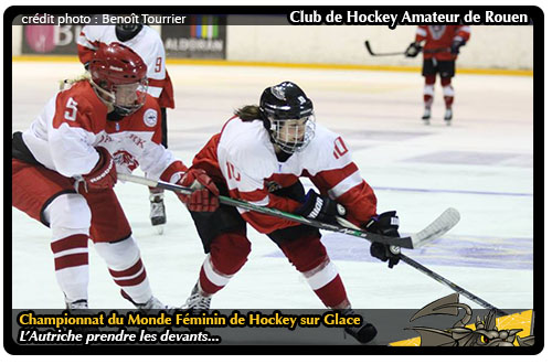 La dernière rencontre de la journée oppose Danoises et Autrichiennes, les deux équipes démarrent sur un rythme élevé, cependant aucune ne peut se targuer d'avoir une occasion franche. Il faut attendre six bonnes minutes pour voir une joueuse Autrichienne se faufiler devant le filet Danois, son tir du revers frôle le montant. Les Autrichiennes, dominatrices dans le jeu, ouvrent la marque au milieu du tiers, un tir contré revient par hasard dans la crosse d'Anna Meixner qui n'a plus qu'a pousser le palet au fond de la cage (1-0 à 9,56'). Le Danemark réplique par un deux contre un, que la gardienne Autrichienne stoppe d'un double arrêt efficace. La première pénalité est sifflée contre ces mêmes Danoises, qui résistent efficacement aux assauts Autrichiens. Plus que deux minutes à jouer dans ce premier tiers lorsque le Danemark revient au score par Michelle Weis sur une contre attaque rondement menée (1-1 à 18,17'). Un premier tiers complètement équilibré, laisse les deux équipes dos à dos au moment où retentit le premier gong de ce match.