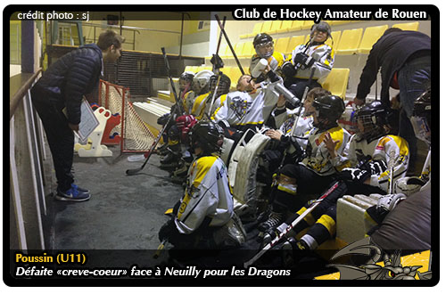 Pour autant, dès le début de la deuxième période, Neuilly reprenait le fil des affaires offensives en égalisant sur un rebond parfaitement négocié. Alors que dans les tribunes la tension montait des quelques échelons entre les partisans, les deux équipes continuaient dee se livrer un joli combat sur la glace. Malheureusement, pour les Dragons, les joueurs de Neuilly allaient prendre la main dans la partie. Doublant la mise à quelques minutes de la fin de la période puis creusant l'écart à 3-1, les parisiens s'envolaient vers un succès mérité même si les Dragons n'auront jamais démérité jusqu'aux dernières secondes où ils parviendront à réduire la marque à 3-2 dans un dernier effort. Même si cette dernière embardée offensive ne suffira pas pour permettre aux dragons de revenir, c'est la tête haute et avec la fierté de porter le Dragon sur le maillot que les rouennais regagneront le vestiaire face à une équipe de Neuilly sportivement méritante. Sportivement uniquement, tant certains sur le banc des Nocéens auront oublié les vertus de notre sport, le respect, la joie d'encadrer des « gamins » de 9-10 ans et que le sport aux cotés d'enfants n'est surtout pas un exutoire de frustration d'autant plus quelques jours après la fin d'une suspension d'un mois pour « incorrections envers arbitres et manquement à l'esprit du sport et à son éthique » Comme quoi il y a des leçons que l'on ne retient pas.