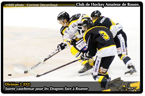 Jamais en Division 2 jusqu'alors une équipe adverse était parvenu à infliger un tel revers à un formation jaune et noire. Si en 2009, Lyon était venu s'imposer 7 buts à 4 sur l'Ile Lacroix alors qu'en 2012 sur leur glace les Peaux-Rouges d'Evry balayaient les rouennais 9-0, la première confrontation entre Roanne et Rouen aura viré au cauchemar pour des Dragons, dépassés, contraints de s'incliner sur le score fleuve de 4-12. Pourtant l'entame de la rencontre ne semblait pas être hors propos pour des Rouennais qui tenaient la dragée haute face à des Renards bloqués offensivement. C'est passée la barrière des dix minutes dans la première période que la rencontre basculera. Victimes d'une contre-attaque meurtrière en désavantage numérique de Xavier Judicael (12'51), les Dragons, un moment absent, payaient le prix avec un deuxième but subi dans la foulée sous la houlette du joueur U22 lyonnais Victor Fanget (14'33) Même si dans la foulée Rouen tenait à répliquer par l'intermédiaire d'Antoine Mony (14'47), la partie semblait mal embarquée alors en supériorité numérique Vladislav Lescovs décochait la troisième flèche (16'52), imité une minute plus tard par Alexandre Monnier (17'53) Menés 4 buts à 1 à quelques encablures de la fin de la première période, la bouffée d'oxygène apportée par le but du revers de Maxence Grollier en toute fin de période (19'02) laissait respirer des Dragons apoplectiques.