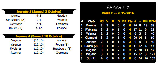 Au classement, les Rouennais restent dans le bon tempo avec la sixième place à deux points de la troisième place du podium occupée justement par les Lynx de Valence derrière un duo composé des Renards de Roanne et des Français Volants de Paris auteurs de la « grosse performance » de la 3ème journée avec leur victoire 9-4 à la patinoire de Clermont-Ferrand.