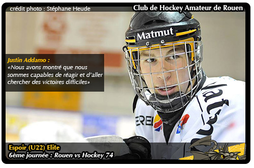 Décisif le week-end dernier en Division 2 avec deux buts (lire par ailleurs), particulièrement actif dans la victoire des U18A ce samedi face à Villard-de-Lans (lire par ailleurs), Justin Addamo aura marqué à nouveau de son empreinte le match U22 de ce dimanche en étant impliqué dans les trois buts rouennais lors de la victoire en prolongation 3-2 face à Hockey 74.