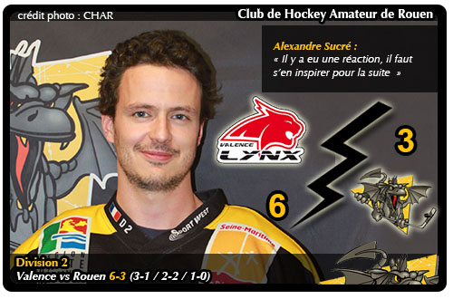Face à une équipe de Valence invaincue en championnat avec deux victoires obtenues à Strasbourg (3-4) et à domicile face à Annecy (2-0), les Dragons rouennais auront fait mieux que de résister dans la tanière des lynx en dépit d'une première période chaotique. « On a connu beaucoup de difficultés pour s'adapter à la taille de la glace plus petite qu'à Rouen. Comme souvent, nous commençons à jouer alors que nous sommes menés 2 à 0 » regrettera le capitaine rouennais à l'issue de la partie. Ainsi avant la barrière des dix minutes dans le premier tiers les Dragons accusaient déjà un retard de deux buts au tableau d'affichage. Ouvrant le score par l'intermédiaire de Simon Pelisse (08'33), les Lynx de Valence patientaient à peine une minute avant de torturer à nouveau défensivement le dragon en faisant le break cette fois par l'entremise de l'autre frère Pelisse, Alexis cette fois (09'59) Avec le spectre de la lourde défaite cauchemardesque subie à domicile face à Roanne la semaine dernière (lire par ailleurs), les Rouennais mettront quelques minutes à accuser le coup avant de rebondir aussi sec par l'intermédiaire de David Fritz-Dreyssé pour la réduction du score (2-1 à 17'44) Malheureusement pour les rouennais, un « troisième but encaissé juste à la fin fera très mal aux rouennais » après que Jonathan Manon n'ait porté la marque à 3-1 dans la dernière minute de jeu du premier tiers (19'22)