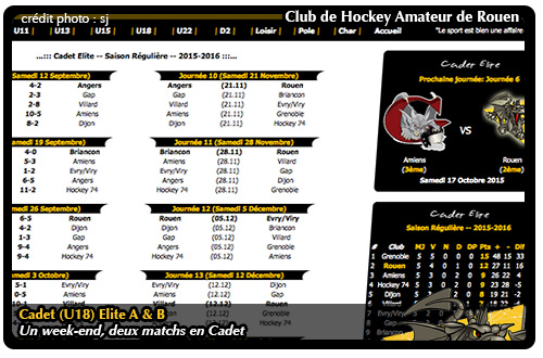 Deux matchs au programme pour les cadets A et B les uns à l'extérieur à Amiens, les autres à domicile face à Tours avec un seul objectif celui de poursuivre sur la bonne dynamique enclenchée depuis le début de la saison. Alors que la plupart des équipes du championnat U18 Elite B possèdent à leur compteur au classement entre cinq et six rencontres, l'équipe jaune et noir au gré d'un calendrier particulièrement débraillé n'aura joué que trois rencontres : à Amiens (1-3), à Tours (2-3) et plus récemment à Mulhouse (0-9, lire par ailleurs) Trois matchs à l'extérieur pour trois victoires qui offrent aux Dragons une très jolie quatrième place au classement juste derrière un trio composé d'Anglet, Strasbourg et Grenoble (2)