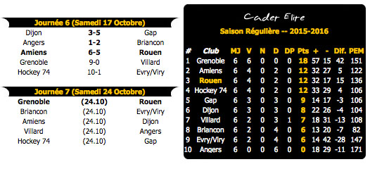 Désormais à six points d'intouchables grenoblois, Rouen se retrouve à la troisième place au classement englué entre Amiens et Hockey 74 ex-aequo à douze points avant un périlleux déplacement à Grenoble qui pourrait les ranger au dernier rang du carré de ce championnat U18 Elite A en cas de défaite.