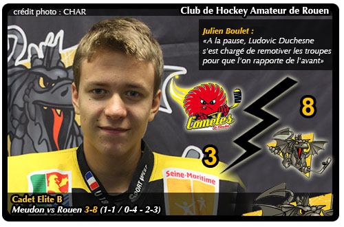 Pour autant, pour les Dragons, il faudra patienter jusqu'à la deuxième période pour voir les rouennais prendre définitivement la marque dans cette rencontre. Auparavant, c'est un soupçon bredouillant que les rouennais aborderont cette rencontre. « Nous avons eu du mal à débuter la rencontre face à Meudon. Nous avons peut-être pris ce match à la légère et sur la première période nous sommes globalement dominés et un but encaissé par notre ancien camarade Antoine Figueira. Une erreur défensive de Meudon / Boulogne permet à Arthur Zavani de se faufiler et de ramener le score à 1-1 en box play sur une faute commise sur moi après m'être fait rentrer dedans » confirme Julien Boulet, le portier rouennais aux premières loges de la rencontre à l'issue d'une première période où les rouennais devront se contenter d'un match nul. « A la pause, Ludovic Duchesne s'est chargé de remotiver les troupes pour que l'on rapporte de l'avant »