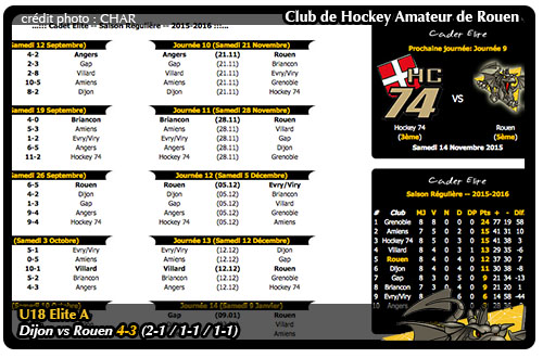 Ne profitant pas de la défaite de Hockey 74 à Villard-de-Lans (4-2), au classement, les Dragons, au lieu de retrouver le podium, dégringolent d'une place. Coincés à la cinquième place entre Villard-de-Lans et Dijon, les Rouennais auront une trêve d'une semaine pour retrouver leurs esprits avant un nouveau triptyque à l'extérieur à partir du 14 novembre les conduisant à Hockey 74, Angers puis enfin à Briançon. 3800 kilomètres à venir en trois semaines pour les jeunes rouennais et surtout l'ambition de retrouver le sourire à l'extérieur et briser cette délicate série de quatre revers consécutifs sur la route cette saison.