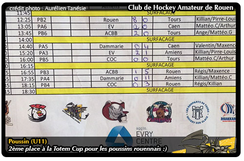 Une petite semaine après leur tournoi disputé à Rouen (lire par ailleurs), les Poussins rouennais se consacraient ce week-end à la toujours attendue « Totem Cup » disputée entre Evry et Viry. Après avoir été finaliste malheureux face à Boulogne (3-4) en 2013 et vainqueur du match de poule 3ème place face à Evry / Viry 4-1 en 2014, le Dragon jaune et noir aura été l'auteur d'une joli parcours à nouveau en 2015 avec une place en finale décrochée face aux Gothiques d'Amiens au terme de trois jours de joutes glacées.