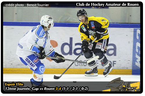 Privés de plusieurs éléments clefs : Aurélien Dorey, Quentin Papillon, Vincent Nesa, Fabien Colotti retenus par l'équipe Magnus disputant la demi-finale de la Coupe d'Europe et Brieuc Houeix qui vivait ce dimanche son dernier week-end de convalescence suite à sa blessure contractée à Villard de Lans le 25 octobre, les Dragons face à une équipe de Gap au complet pouvaient craindre un revers de fortune en dépit du classement peu glorieux des rapaces. Si sur le papier, cette rencontre de la douzième journée s'apparentait au choc des extrêmes entre le leader rouennais et la lanterne rouge gapençaise, sur la glace, c'était une toute autre histoire. Blessé à l'épaule lors d'un match amical face à Briançon au mois d'août, le défenseur Pierre Crinon de retour la veille en Ligue Magnus face à Morzine-Avoriaz étrennait son premier match de la saison en espoir avec un but après seulement trois minutes de jeu. Sur un changement de ligne fort aléatoire des rouennais, Karim Marcialis et Pierre Crinon pour l'ouverture du score du second (1-0 à 03'45) Même si Julien Msumbu quelques minutes égalisait sur un rebond consécutif à un lancer de Ludovic Duchesne (1-1 à 06'42), les rouennais, les jambes encore dans le bus, peinaient à entrer proprement dans la zone défensive gapençaise pour s'illustrer offensivement.
