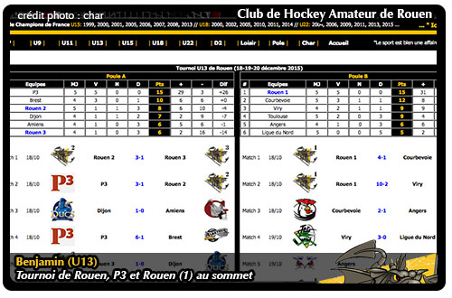Derrière cette furia parisienne, les autres formations s'écharperont pour s'octroyer la meilleure place possible au classement de la poule. Et le moins que l'on puisse dire c'est que derrière P3, il sera bien difficile de dégager une vraie tendance même si Brest et Rouen (2) parviendront tant que bien que mal à tirer leur épingle du jeu. Débutant sur un succès face leurs copains de Rouen (3) 3 buts à 1, Rouen (2) parviendra à décrocher le match nul face à Dijon (1-1) avant de trébucher face aux Gothiques d'Amiens (1-4) Bon an mal an au gré des résultats des autres revers des uns et des autres, Amiens trébuchant face à Dijon (1-0), Dijon face à Rouen (3) (0-1), Rouen (2) avec ses 7 points au classement pouvait aborder sa dernière rencontre de la journée face à un Brest intenable, seulement vaincu par P3. Et les bretons boucleront leur journée avec un étroit mais précieux succès 1-0 face aux Dragons de Rouen (2) Du coté de Rouen (3), même si la journée aura été faite de hauts et de bas, la jolie victoire jaune et noire face à Dijon (1-0) aura donné du baume au cœur aux jeunes Dragons qui bien que derniers de la poule peuvent encore jouer les trublions pour l'un des deux derniers matchs de poule joué dimanche.