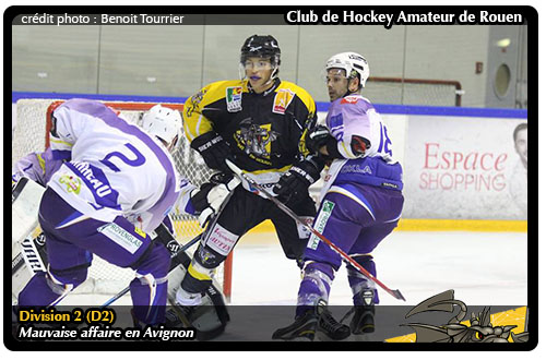 A quatre matchs de la fin de la saison régulière avec notamment une double confrontation face aux Chevaliers du Lac d'Annecy, deuxième de la poule derrière Clermont, l'aventure en Avignon était l'occasion pour les rouennais de se rapprocher au classement des Castors. Malheureusement en s'inclinant 5 buts à 4 au terme d'une rencontre où ils auront couru après le score pendant 57 mn, les rouennais auront grandement hypothéqué leur chance d'éviter la dernière place qualificative en play-offs. Indisciplinés chroniques depuis le début de la saison, les Dragons auront à nouveau payé cher leurs minutes de pénalités concédées face à Avignon. En effet, alors qu'au sein de la division 2, il existe de « solides clients » comme du coté de Roanne avec ce sot d'Alexandre Monnier à nouveau expulsé ce samedi cette fois ci face à Valence, l'équipe jaune et noir reste en tête du classement des pénalités sur l'ensemble de la division 2 et le paiera rubis sur l'ongle face à Avignon avec deux buts concédés à Kévin Richard en supériorité numérique (03'06 & 08'57) Menés 2 buts à 0 avant la barrière des dix minutes, les rouennais mettront un point d'honneur à revenir dans la rencontre par l'intermédiaire de l'enfant de la D2 rouennaise, Justin Addamo (19'38)