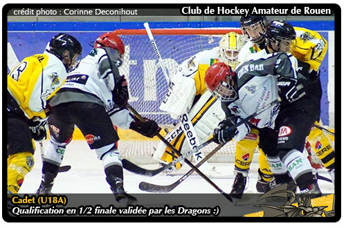En effet, sur une contre attaque rondement menée, Adrien Colomer, alimenté par le défenseur Vivien Cabuzel, parvenait à tromper la vigilance d'Erwan Jaouen en infériorité numérique (42'53) Une bien mauvaise affaire pour les rouennais qui sans paniquer pour autant, se trouvaient à nouveau crispés par un éventuel retour en grâce des visiteurs. Et au fil du temps s'écoulant, les minutes se feront des heures et il tardait à l'équipe jaune et noir que la sirène finale ne daigne enfin retentir. Sauvant à force d'abnégation une séquence en infériorité numérique (52'45), les Dragons espéraient bien avoir le plus gros du travail en congelant l'opportunité briançonnaise de revenir à parité. D'autant plus qu'au détour d'une contre-attaque Justin Addamo scellait sans aucun doute tout suspense en portant la marque à 3-1 (54'05) Pour autant, jamais Briançon ne lâchera l'affaire dans ces deux rencontres. Au courage, les Briançonnais parviendront à revenir à nouveau dans le jeu par l'intermédiaire d'Aurélien Haaser en avantage numérique (3-2 à 54'57) Néanmoins trop tard pour espérer inverser la tendance de la série. Alors que la fin de match se tendait relativement contraignant le trio des zébrés à accentuer leurs coups de sifflets, les rouennais, eux, en ajoutant un dernier but en cage vide par Hugo Dumont (58'50) filaient promptement vers la qualification en demi-finale où ils retrouveront l'épouvantail du championnat, les Brûleurs de Loups de Grenoble qui auront atomisé en quart de finale les pauvres Ducs de Dijon (14-1 / 13-2)