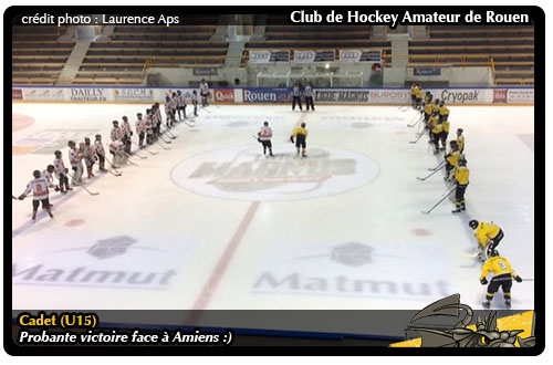 Vainqueurs 5-0 de leur rival amiénois, les rouennais en profitent pour récupérer la première place du classement. A deux journées de la fin avec la réception de l'association Evry / Viry (16 mars) et un déplacement chez les Bisons de Neuilly sur Marne (19 mars), les rouennais se trouvent en ballotage favorable pour décrocher la première place de la poule, synonyme de qualification directe en demi-finale du championnat de France U15.