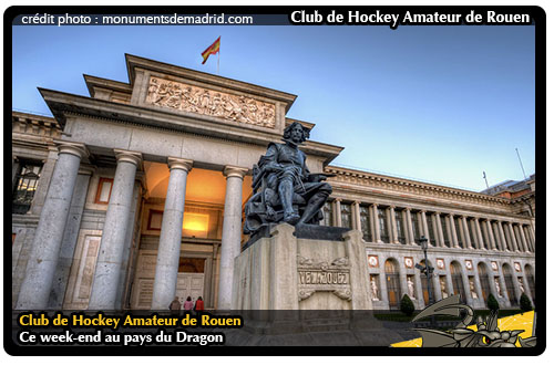 Après un premier week-end de tournoi bien rempli (lire par ailleurs), nos Dragons repartiront à l'aventure en cette fin de semaine avec un programme tout aussi sympathique. Si cette fois, seulement deux tournois seront au rendez-vous, l'exotisme sera au programme pour les rouennais U16 qui profiteront de leur week-end pour disputer un tournoi à Madrid. Si les charmes de la cité royale, capitale de l'Espagne ne sont plus à démontrer entre la « Puerta del Sol » et la « Plazza Mayor », ce n'est pas au Musée du Prado que les Dragons passeront leur séjour madrilène mais sur la glace à l'occasion d'un tournoi à quatre organisé par la Fédération de Hockey sur Glace Espagnol en compagnie de la sélection anglaise U16, de la sélection espagnole U16 et des allemands de Mannheim. Un joli programme en perspective pour les rouennais avec quatre matchs à négocier sur le glaçon ibérique (cliquez ici pour le planning)