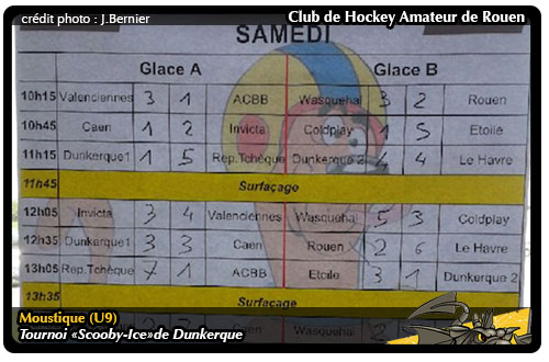 Parmi la liste des tournois disputés parles moustiques rouennais, celui de Dunkerque prend une part importante et signification particulière. Très heureux de se rendre dans le nord à l'occasion du tournoi U9 « Scooby-Ice » de Dunkerque, les rouennais, eux aussi, voulaient, à l'image de leur entraîneur Ludovic Duchesne, disputer plus que tout ce tournoi crée en hommage au petit Hugo, jeune joueur Dunkerquois décédé le 08 novembre 2014 suite à un palet reçu derrière l'oreille lors d'un match de division 1.