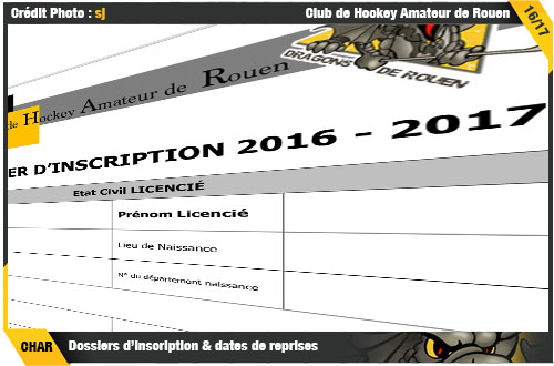 Les dossiers COMPLETS sont à remettre au secrétariat du CHAR (patinoire Ile Lacroix, 1ère Etage, bureau 111) au moins une semaine avant la date du premier entraînement de la catégorie concernée.