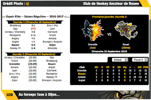 Après une entrée en matière encourageante au Pays Basque avec une victoire sérieuse 3 buts à 1 face à Anglet, c'est sur l'Ile Lacroix que les U20 rouennais poursuivaient leur parcours en championnat face à des Ducs de Dijon qu'ils parviendront à dominer dans la douleur 4 buts à 3.