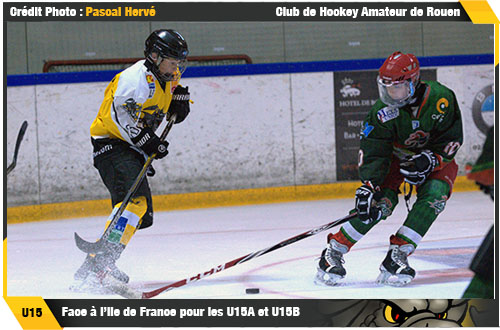 Dans la foulée, les U15A enchâssaient la glace des bords de Seine pour sa confrontation face aux Jokers de Cergy. Leaders incontestés de la poule avec cinq victoires en autant de rencontres, les cergyssois auront beau s'évertuer courageusement à défendre leur territoire, l'écart entre le leader et la lanterne rouge de la poule semblait trop important. Le décor planté avec cinq buts dans la première période sans en rendre le moins, les Rouennais poursuivront sur le même rythme tout au long de la rencontre en respectant leurs adversaires. Au moment où la sirène finale de la rencontre retentissait, les Dragons pouvaient se satisfaire de ce probant succès face aux Jokers sur le score de 17-1. Statu quo au classement de la poule rouennaise, les Dragons après six rencontres restent positionner à la première place. Dans le sillage des rouennais, les Coqs de Courbevoie profitent de leur victoire 8-4 face à Boulogne pour revenir à hauteur des Gothiques d'Amiens, exempts pour cette journée. Avec trois points d'avance sur leurs deux poursuivants Amiens et Courbevoie, les rouennais devront patienter deux semaines et la réception de Courbevoie pour retrouver le parfum savoureux du championnat.