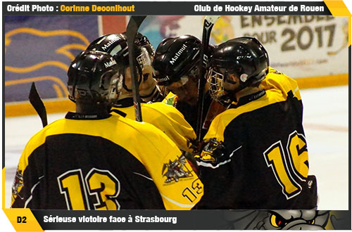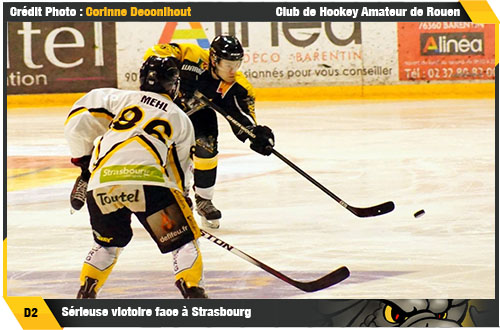 Une semaine après avoir repris goût à la victoire sur la glace des Castors d'Asnières (2-1, lire par ailleurs), les Dragons de Division 2 auront récidivé ce samedi, cette fois à domicile face à l'Etoile Noire de Strasbourg (2) Avec une seule victoire décrochée à Wasquehal depuis le début de saison, les Alsaciens semblaient être une proie envisageable pour les Dragons. Pour autant, si les rouennais assureront l'essentiel avec les trois points de la victoire, les affaires ne seront pas si simples pour les Normands face à une Etoile Noire tenace qui se permettait même d'ouvrir le score dans la rencontre. En effet, alors que depuis le début de la première période, le rythme semblait peu soutenu et les deux équipes relativement passives, sur la deuxième séquence en avantage numérique, les Alsaciens trouvaient l'ouverture. Une première alerte lancée par Yannick Maillot obligeait le portier rouennais, Julien Gaubert à s'interposer. Contraint de lâcher le rebond, le palet sans attache, restait vacant face au but jaune et noir. Alors que la défense rouennaise mettait du temps à réagir, Thibaut Pousse profitait de la nonchalance jaune et noir, pour catapulter le palet au fond des filets rouennais pour l'ouverture du score (0-1 à 09'28) De quoi secouer un Dragon apathique qui réagissait immédiatement dans la foulée par un lancer à bout portant d'Antonin Cartron (12'55) C'est en avantage numérique que les rouennais finiront par trouver l'égalisation quelques secondes plus tard. Profitant du trafic devant la cage généré par Roman Moreau et Julien Thomas, Alexandre Sucré avait tout le loisir de décocher, depuis la ligne bleue, un lancer qui perturbait le gardien strasbourgeois totalement masqué alors que Julien Thomas astucieusement, déviait le palet pour le 1-1 (13'08) Moins de deux minutes plus tard, toujours aussi excité à l'idée de déserter l'arrière-garde jaune et noir pour se porter à l'avant, le défenseur Brieuc Houeix s'offrait un joli déboulé dans le camp alsacien pour lancer une violente flèche à la précision chirurgicale dans le coin droit du but de Ludovic Rio (14'41) De retour aux affaires après une longue série de blessures, le défenseur rouennais envoyait un très plaisant message en célébrant avec délectation son premier but de la saison. Toutefois, après deux minutes de franche excitation, les Dragons retombaient peu en peu dans l'apathie et les cinq dernières minutes de la première période seront nettement moins enthousiasmantes alors que les Alsaciens bénéficiaient dans les deux dernières minutes de jeu d'un double avantage numérique qui aurait pu renverser la tendance du match. A la peine en fin de tiers, les rouennais à trois contre cinq faisaient front et le trio diabolique Houeix – Cantagallo – Cartron faisait merveille au moment de contrarier les velléités offensives strasbourgeoise.