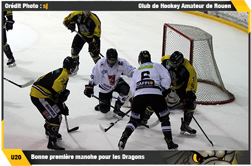 Dans la difficulté en quart de finale face aux Ducs d'Angers (lire par ailleurs), c'est non sans difficulté que les Gothiques décrocheront leur traditionnel escapade sur les bords de Seine face à des rouennais, certes plus sereins face l'association Briançon / Avignon (lire par ailleurs) mais présentant tout de même quelques signes de fébrilité inquiétants. Si les rouennais restaient sur quatre succès d'affilée cette saison régulière, il est de tradition de dire qu'avec les play-offs, une nouvelle saison commence et que toutes les cartes étaient rebattues pour une nouvelle aventure. Et pourtant d'entrée de jeu, les augures souriaient aux Dragons alors qu'après cinq minutes de jeu, Joran Reynaud dans un angle fermé trouvait l'ouverture du score face à Kévin Deliac moyennement inspiré sur l'affaire (05'28) Douze secondes seulement et un certain métier seront nécessaires pour voir l'égalisation amiénoise. Sur l'engagement suivant, alors que le portier rouennais Erwan Jaouen semblait être parvenu à geler de la mitaine le palet, un habile cinglage dessus permettait à Thomas Suire de faire glisser le palet au fond des filets jaune et noir (05'40)