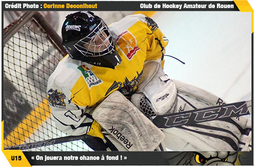 Après les U17 et les U20, c'est désormais au tour des U15 rouennais de s'attaquer à leurs phases finales avec le début des ½ finales ce samedi sur l'Ile Lacroix. 3 jours (samedi, dimanche, lundi), 3 matchs (Amiens, Courbevoie, Anglet) pour décrocher une des deux places qualificatives en finale du championnat de France le week-end prochain, possiblement à Rouen également. Un excitant challenge qui ne laisse pas insensible les rouennais en préparation depuis plusieurs jours, le regard fixé vers cet objectif des demi-finales à l'image de leur gardien Killian Siourt, la « force tranquille » de cette escouade U15 « Nous sommes plutôt sereins. Les derniers entraînements se sont bien passés, on a connu un trou lors de nos derniers résultats qui nous a permis de prendre conscience qu'il fallait se remettre au travail pour atteindre nos objectifs, ça peut marcher ! On jouera notre chance à fond » commente le rouennais d'origine conscient qu'il aura sa part d'ouvrage dans ce rendez-vous « Il faut que j'aborde les matchs un par un, je n'ai pas la boule au ventre, je ne suis pas plus stressé que ça, je sais que j'ai un travail à faire et je dois le faire. Si je ne fais pas mon boulot, je sais que cela sera une chance en moins pour l'équipe mais cela ne repose pas que sur moi »