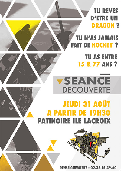 Jeudi 31 août 2017 : Séance découverte (cliquez ici) Envie d'essayer le hockey ? Jamais patiné ? Cette séance découverte (gratuit) du jeudi 31 août (à partir de 19h30) est pour vous ! Relevez le défi de grimper sur la glace des Dragons ! (prêt du matériel gratuit) |