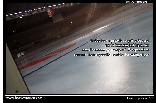 En dépit d'un préavis de grève national déposé par six syndicats pour ce jeudi 23 septembre 2010 afin de protester contre la réforme des retraites adoptée par l'Assemblée Nationale, la patinoire de Rouen restera accessible à l'ensemble des licenciés du Club de Hockey Amateur de Rouen. Ainsi, l'ensemble des entraîments prévus ce jour restent programmés aux horaires habituels. L'ensemble des catégories devant s'entraîner sur la petite piste ou la piste olympique sont concernées à savoir :