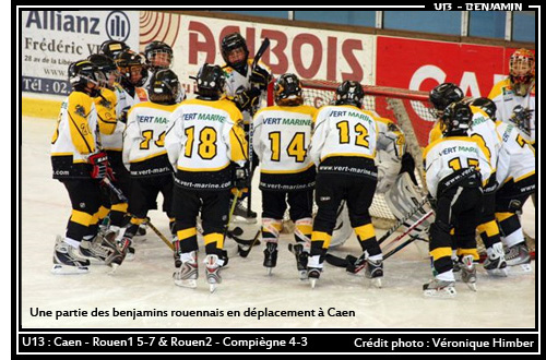 De victoire, il sera question aussi pour les Benjamins 1 en déplacement en Basse Normandie à Caen. Les petits protégés d'Alexandre Sucré prendront la mesure de leurs voisins de Normandie 7 buts à 5. Largement devant à la « presque mi-match » avec des buts de Lucas Bicheux (13'31, 16'02), Axel Benet (18'46) et Jules Lefebvre (23'46), les rouennais voyaient leur avance fond un tantinet d'ici à la fin du match, allant même jusqu'à s'incliner durant la troisième période. En effet, repris sur la fin de la deuxième période par un but du caennais Charles Duech, les rouennais menaient 4 buts à 1 avant de jouer une troisième période où les buts s'échangeront de part et d'autres.