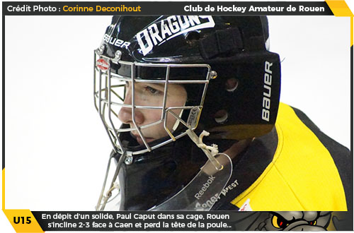 Face à Caen, les rouennais s'étaient volontairement privés de trois joueurs retenus en surclassement pour le match U17 Elite face aux Diables Rouges de Briançon. Quoiqu'il en soit, pas d'excuses pour les Dragons dans cette rencontre tant ils trouveront une belle opposition avec cette équipe de Caen, qui sans nul doute, fera un bout de chemin cette saison. Dès l'entame de la rencontre, les Caennais s'installaient dans le camp jaune et noir, cinq minutes de domination caennaise infructueuse qui donnait néanmoins le ton de rencontre. Si les Dragons répondaient par intermittence notamment via la « ligne des 2004 » à plusieurs reprises, globalement la première partie du tiers se montrera à l'avantage des Calvadosiens ,au jeu intense et physique, qui prendront plaisir à se saisir de la moindre opportunité pour porter l'estocade en contre. Alors que le tableau des scores de la patinoire de l'Ile Lacroix affichera un honnête 0-0 à l'issue de la première période, les deux équipes ou plutôt les deux portiers, Paul Caput pour Rouen, Eliot Regnier pour Caen, se livreront un duel à distance pour tenir leur cage inviolée.