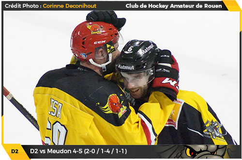 05'25, 1-0, Rouen (2) : Nicolas Plaquevent (Matti Barin) 10'35, 2-0, Rouen (2) : Arthur Nadaux (Alexandre Sucré, Robin Rabl) 21'40, 2-1, Meudon : Benjamin Brault (Dimitri Juan) 30'29, 2-2, Meudon : Didzis Jansons (Jimmy Paradis, Yohann Guilhem) 33'43, 2-3, Meudon : Benjamin Brault (Filip Vychodil) 35'33, 3-3, Rouen (2) : Brieuc Houeix (Lévy Raux) 36'27, 3-4, Meudon : Aymeric Millet (Didzis Jansons) 41'03, 3-5, Meudon : Jimmy Paradis (Didzis Jansons) 52'31, 4-5, Rouen (2) : David Fritz-Dreyssé (Enzo Cantagallo, Julien Msumbu) |