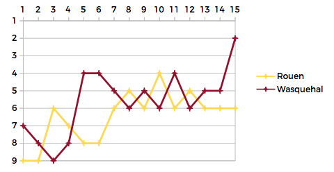 Toutes deux auteurs d'un début de saison moyen, tout comme Rouen, Wasquehal aura connu deux défaites pour ses deux premiers rendez-vous de la saison, depuis lors, les deux formations auront pris leur envol avec comme point d'orgue la 8ème journée et cette confrontation entre les deux adversaires dans les Hauts-de-France. Ce soir là, il fallait du nez pour imaginer une victoire des Rouennais aussi propre sur le score de 3-0 avec à la clef un blanchissage pour le portier Quentin Papillon.