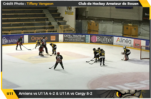 Placés dans deux poules différentes en championnat, Amiens et Rouen en U11 n'auront eu que peu d'occasions de se croiser cette saison, un « manque affectif » pour les deux équipes pallié en partie par quelques escarmouches ici ou là en tournoi ou en match amical comme cette petite visite un samedi soir en Picardie. Toujours savoureuse, cette énième confrontation entre les deux rivaux historiques du hockey de plaine tournait à l'avantage des rouennais en début de rencontre. Ouvrant le score rapidement, les rouennais se sentaient à leur aise sur le glaçon rouge et noir. Toutefois, alors que les Dragonnets semblaient bien en place, par deux fois, les Gothiques rappelleront à leurs voisins jaune et noir que la glace du Coliséum leur appartenait. Deux buts rouge et noir pour conclure une première période sur le score de 2 buts à 1 à la faveur de la troupe amiénoise. Alors que pour la troisième période de la rencontre, les gardiens de deux équipes fermeront fermement la porte aux chasseurs de but adverses, le tiers médian permettra aux jeunes amiénois de s'envoler au score. Même si les Dragons parviendront néanmoins à trouver l'ouverture, en ajoutant deux buts à leur compteur, les Gothiques célèbreront un joli succès 4 buts à 2 face à leurs voisins normands.