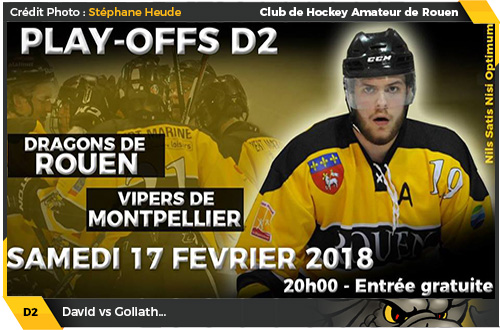 Capables de chuter à la maison face à la lanterne rouge de la Poule B tout en étant en mesure de dominer l'un des ténors de la poule à Amneville, les rouennais auront maitrisé tout au long de la saison l'art du grand écart avec néanmoins d'ores et déjà une saison plutôt encourageante. Alors que l'on promettait en début de saison un destin en poule de relégation aux cotés de Strasbourg (2), finalement voir les Dragons en play-offs est déjà un motif de satisfaction. Si les play-offs en D2 ne sont pas nécessairement une spécialité rouennaise (lire par ailleurs), le caractère imprévisible des Dragons sur la glace empêche de tirer des conclusions pour le moins trop hâtives, Châlons, Amnéville ou encore Wasquehal s'en souviennent encore. Un obstacle de taille, un Everest à gravir, un Goliath à faire tomber, tous les qualificatifs sont bons pour illustrer cette série de play-offs face aux Vipers pour une équipe de Rouen qui devra composer sans certaines de ses forces vives retenues en équipe de France. C'est ainsi que le portier Gaëtan Richard, les défenseurs Yoan Salve, Jules Lefebvre et les attaquants Arthur Zavani, Benjamin Bérard et Robin Rabl manqueront à l'appel pour cette première manche. Une ligne complète. Rien que ça. Un handicap qui n'empêchera pas les rouennais de mettre tout le cœur dans la bataille pour taquiner les Goliaths de Montpellier.