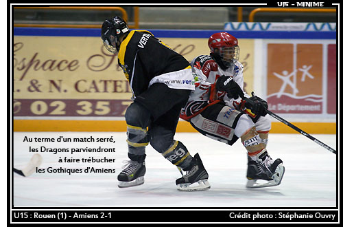 Au pays du Dragon où l'étendard jaune et noir flotte fièrement au sommet de sa patinoire, il n'est pas désagréable d'assister à une déconvenue de leur voisin au blason gothique rouge et noir. Pour les Minimes rouennais, nul doute qu'ils auront pu apprécier de faire battre en retraite le bataillon amiénois en championnat 2 buts à 1.