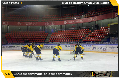 Pourtant vainqueurs 6 buts à 5 la veille (lire par ailleurs), les U17 rouennais n'auront jamais réussi à se mettre dans le bon tempo de cette deuxième rencontre des demi-finales face aux Brûleurs de Loups de Grenoble. La faute à une équipe de Grenoble conquérante face à une équipe rouennaise à tendance poltronne, le train de la qualification passera sous le nez de Dragons qui devront se contenter d'une médaille de bronze pour cette 2017-2018.