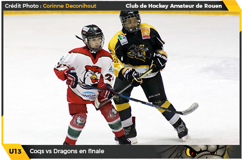 A Amiens tout le week-end pour le compte du carré final interconférence A (lire par ailleurs), les Dragons rouennais U13 auront passé un samedi agréable en s'imposant 3 buts à 1 en demi-finale face à Evry / Viry. Alors que plus tôt dans l'après-midi, les Coqs de Courbevoie et les Gothiques d'Amiens s'étaient livrés à une bataille incroyable dans l'autre demi-finale, les Coqs finissant par s'imposer aux tirs aux buts 6-5 après avoir été mené 2-5 par les jeunes Gothiques, les Dragons rouennais de leur coté se préparaient à disputer le morceau de caoutchouc face aux franciliens d'Evry / Viry. Restant sur une défaite en championnat 2-3, les Dragons entendaient bien ne pas revivre la même déconvenue sur la glace du Coliséum.