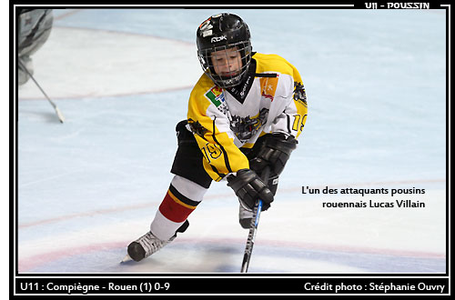 A 5-0, les affaires rouennais étaient plutôt souriantes même si les adversaires du jour des Normands auraient mérité d'inscrire au moins un but, filet justement qu'ils marqueront avant que l'arbitre ne le refuse le palet ayant franchi la ligne une toute petite seconde après la sonnerie du changement de ligne. Quoiqu'il en soit, les Dragonnets poursuivront leur bon travail offensif en ajoutant quatre buts dans la dernière période. Ainsi, Louis-Ellys Lebras ajoutait un but à son compteur personnel (35'00) tandis qu'Antonin Germond ouvrait le sien sur un lancer heurtant le poteau avant de pénétrer dans la zone sacrée (36'10) Sur la même montée, ce diablotin d'Antonin jouait un tour pendable à la défense compiégnoise en faisant ricocher le palet dans un patin puis dans un autre avant de le voir franchir la ligne de but (36'19) Bien que tombant dans la facilité à certains instants, les quelques errements ici ou là constasté seront remis en place par le banc rouennais, soucieux de rendre une jolie copie. Ainsi, pour conclure l'après-midi à Compiègne, les poussins rouennais ajouteront un neuvième et dernier but par l'intermédiaire de Robin Rabl qui concluera la marque de la rencontre à 9-0.