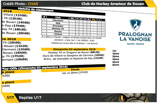 Au sein d'une poule où les rouennais seront orphelins de leur éternel rival mais néanmoins voisin amiénois, les joueurs de la plaine se sentiront bien seul au milieu de la horde des alpins avec en tête de gondole le champion de France en titre, les Brûleurs de Loups de Grenoble appuyés par l'association Hockey 74 et les Rapaces de Gap. 20 matchs pour éviter la 4ème place synonyme de relégation en Poule B, 20 matchs pour se préparer au mieux au dénouement de la saison avec les play-offs. En attendant, cette perspective bien lointaine c'est à domicile que les jeunes Dragons débuteront les affaires face aux Isérois de Grenoble. Auparavant, l'occasion sera donnée aux rouennais de se préparer comme il se doit pour ce nouvel opus du championnat de France U17.