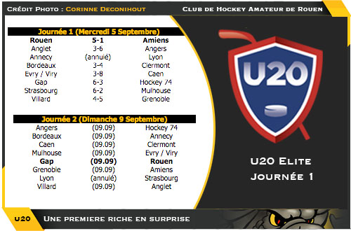 La primo journée U20 qui s'est déroulée ce mercredi aura livré son lot de surprise et de menus enseignements à commencer du côté de l'Ile Lacroix où finalement la victoire des Dragons 5 buts à 1 aura été une quasi surprise, les rouennais restant sur une série de quatre défaites consécutives face aux Gothiques. Encore plus saisissant du coté des autres adversaires des rouennais au sein de la poule A, les affaires n'auront été guère fleurissantes. Exception faite de Grenoble qui tirera son épingle du jeu non sans mal, Anglet et Hockey 74 ne parviendront pas à prendre la mesure respectivement de Angers et Gap, prochain adversaire des rouennais.