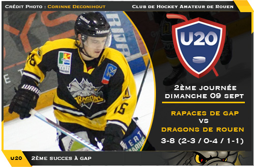 Vainqueurs mercredi derniers en ouverture des Gothiques d'Amiens (5-1), les rouennais auront récidivé dans les Hautes-Alpes en disposant largement des Rapaces de Gap sur le score de 8-3. Alors que dans le même temps, Grenoble s'inclinait en prolongation 4-3 face à Amiens, Rouen s'offre au passage une petite marge au classement avec deux points d'avance sur les Isérois. Pourtant avant d'envisager les trois points de la victoire, les Dragons auront du batailler en début de rencontre notamment face à un Paul Joubert, expert en avantage numérique, qui parvenait par deux fois à tromper la vigilance du gardien rouennais Valentin Duquenne (02'23 & 10'53) Parfait dans son rôle de trublion, l'attaquant gapençais trouvera néanmoins du répondant dans le camp des Dragons. Ainsi, à l'ouverture du score gapençaise (02'23), Benjamin Berard répondait avec son premier but de la soirée (05'53), au deuxième but haut-alpin, c'est Lucas Villain à 5 contre 3 qui rétorquait sèchement en ramenant le score à 2-2 (12'19) Et peu avant la première pause, dans la dernière minute de jeu, particulièrement en vue, Benjamin Berard se signalait à nouveau en portant la marque à 3-2, les Dragons menant pour la première fois de la rencontre au score (19'39)