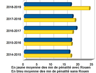 En effet, à la décharge du corps arbitral, il semblerait que statistiquement les Dragons soient plus exposés cette saison que l'ensemble des autres équipes. Alors que depuis le début de la saison, les trois équipes de la Poule A (Gap, Grenoble, Hockey 74) restent dans les normes habituelles avec 17 mn de moyenne par match, dès que l'on y ajoute Rouen, la moyenne s'envole à 23,8 mn alors que traditionnellement depuis 5 saisons, les rouennais se situaient dans les moyennes nationales.