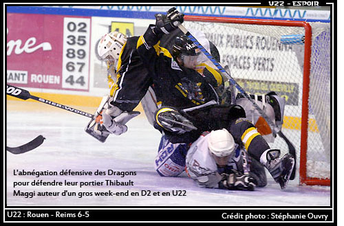 En attendant de penser à la visite des Isérois sur l'Ile Lacroix, double visite d'ailleurs avec les cadets le samedi et les espoirs le dimanche, c'est face à la saugrenue association espoir entre Reims et Briançon que les Dragons rouennais devaient faire place. Certes, Loïc Lampérier et Kévin Dusseau en dépit de leur match la veille joué sur l'Ile Lacroix avec Briançon, n'étaient pas alignés sur la feuille de match, en revanche l'autre terreur de cette équipe Pierre-Charles Hordelalay était bien présente et fera la pluie et le beau temps dans ses rangs tout au long de la rencontre. Démarrant tambour battant la rencontre, il ne fallait que deux minutes de jeu pour voir Peter Valier lancer comme une flèche Damien Bourguignon en break. L'attaquant rouennais ne tremblait pas, jouait le coup comme il faut face à Steven Catelin et ouvrait le score (1-0 à 02'06) Dans une première période globalement dominée par les Dragons, les Rémois se procuraient néanmoins quelques sourires sur des occasions individuelles. C'est ainsi que Kévin Ottino profitait d'une passe de Rémi Houque pour égaliser avant la barrière des dix minutes (1-1 à 08'27) Retour en grâce de courte durée pour les joueurs de François Dusseau, Damien Bourguignon cédant dans la foulée le palet à Maxime Lefebvre qui faisait l'essentiel du travail pour doubler la mise des rouennais (2-1 à 09'57) C'est sur ce court avantage que les Dragons quitteront la glace de l'Ile Lacroix avant de creuser sensiblement le trou en deuxième tiers