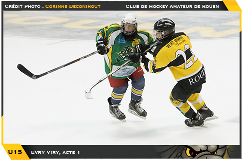Face à la lanterne rouge de la poule, Evry / Viry qui restait sur trois revers consécutifs, c'est une équipe U15A rajeunie à peine sortie du U13 qui se préparait à aborder la quatrième rencontre de championnat des Dragons rouennais. Avec un destin diamétralement opposé à leurs adveraires depuis le début de la saison, les normands comptant trois victoires en autant de rencontre, il n'était pas anodin de voir les rouennais prendre rapidement l'ascendant dans la partie. Sur un lancer pourtant bien lointain et flottant de Eliot Maes, les Dragons prenaient les devants à 1-0 (02'47) Alors que dans la foulée, les Dragons doublaient la mise, cette fois par Benjamin Benoist, sur une tentative presque similaire de la bleue (04'16), mal embarquées, les affaires franciliennes semblaient péricliter au fil des minutes défilantes au tableau d'affichage de la patinoire de l'Ile Lacroix.