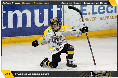 Faut-il encore le rappeler pas de classement dans ce championnat U11 pour protéger l'esprit du jeu et le plaisir de s'amuser sur le glaçon mais des matchs néanmoins avec un enjeu. Alors que lors de leurs deux dernières rencontres jouées, les Dragons U11B seront parvenus à s'imposer par deux fois, la première face aux Drakkars de Caen (2) (8-1), la seconde face au Havre / Saint-Martin-en-Campagne (3-5), sur l'Ile Lacroix face à leurs copains « croco-loups » de l'association Louviers / Cléon, les rouennais prenaient soin de bien débuter la rencontre histoire de garder le sourire le plus longtemps possible. En marquant par deux fois dans la quatrième minute de jeu, les protégés de Victor Durand ne pouvaient pas rendre plus heureux leur entraîneur d'autant plus qu'avant la fin de la période un troisième but permettait aux jeunes rouennais de rentrer au vestiaire en menant 3 buts à 0.